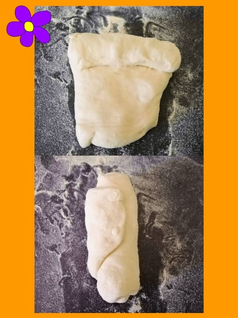 Trasferite l'impasto su un piano infarinato il meno possibile, porzionate in pezzi da 100 g e ad ogni pezzetto praticate 2 pieghe: partendo da un rettangolino, arrotolate dal lato stretto verso di voi fino ad ottenere un rotolino, che ruoterete di 90° e tenendolo in questa posizione (con l'apertura verso l'alto) arrotolate di nuovo verso di voi.